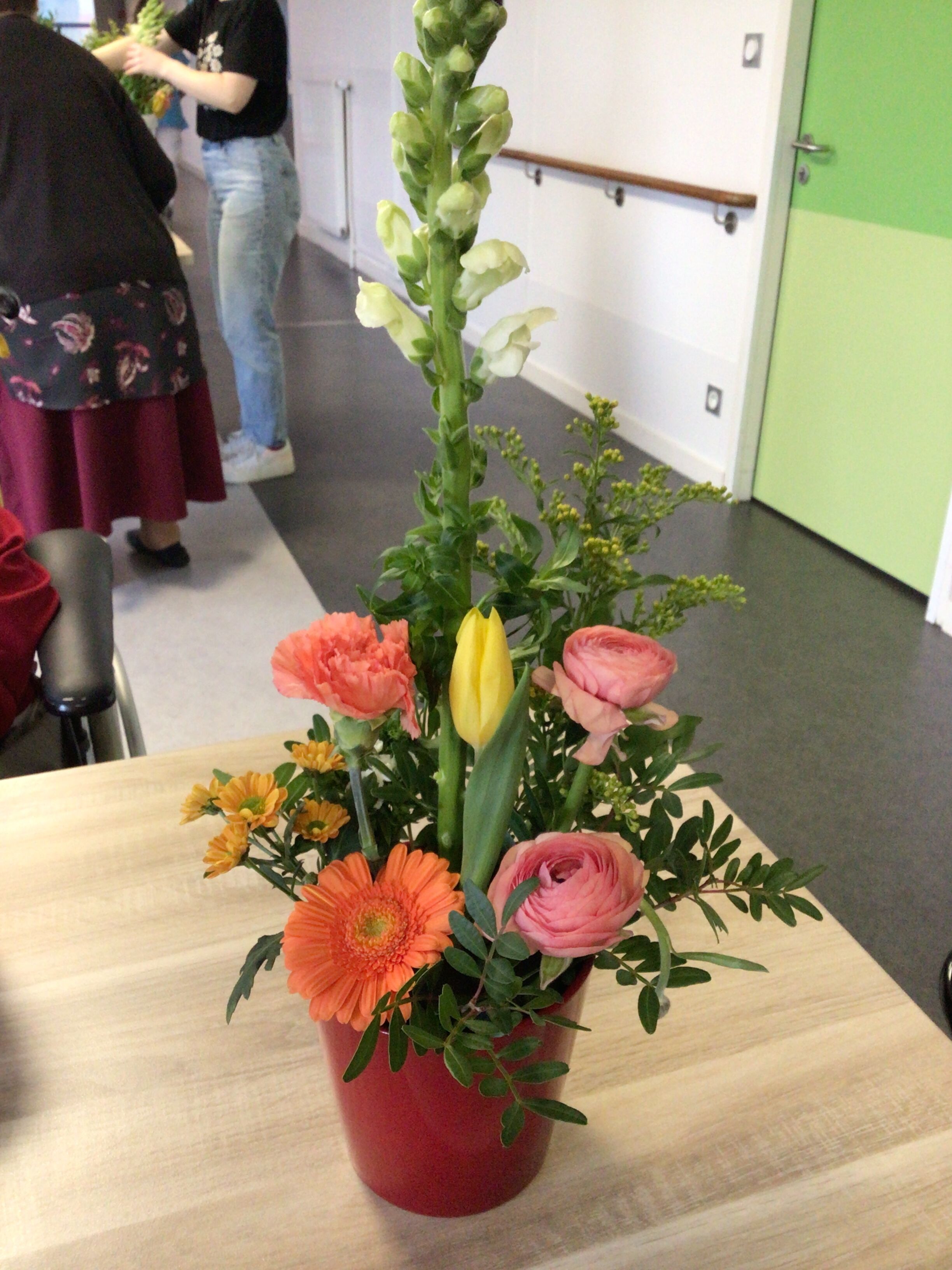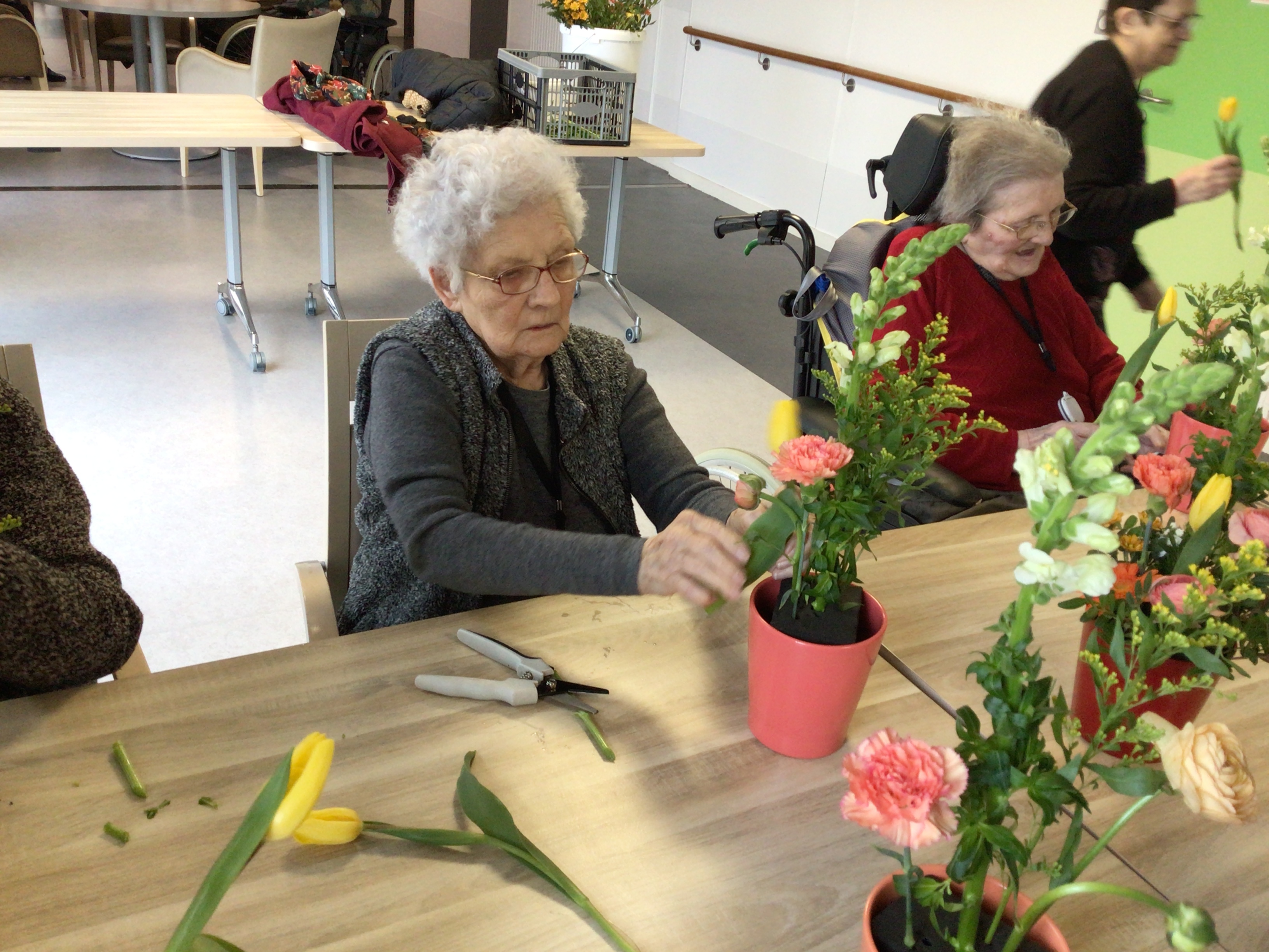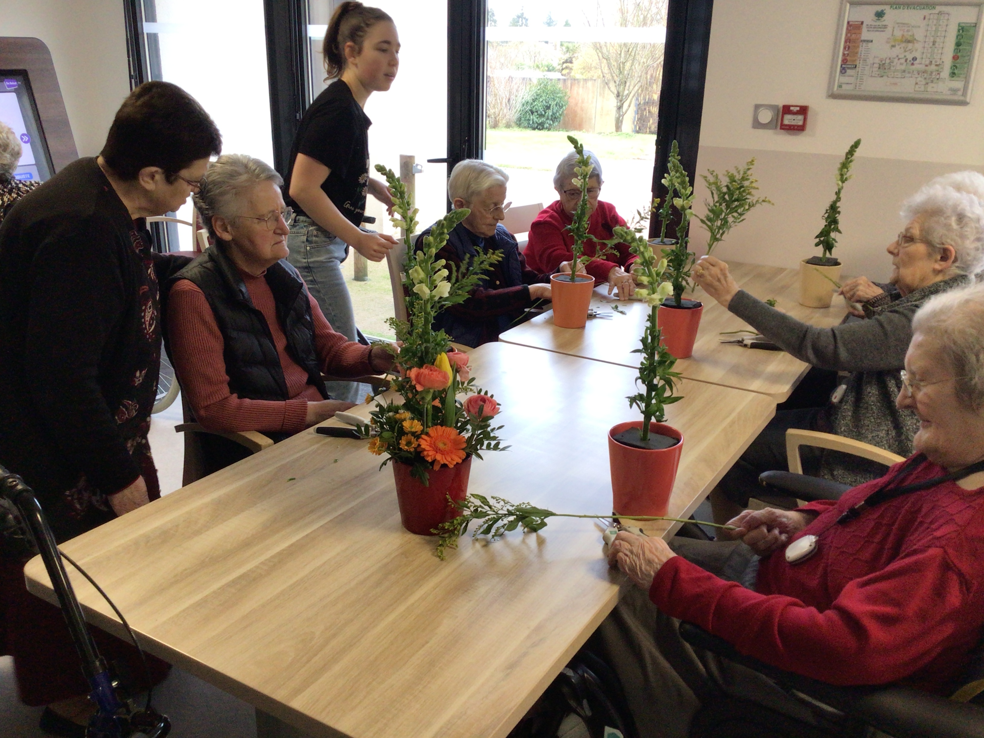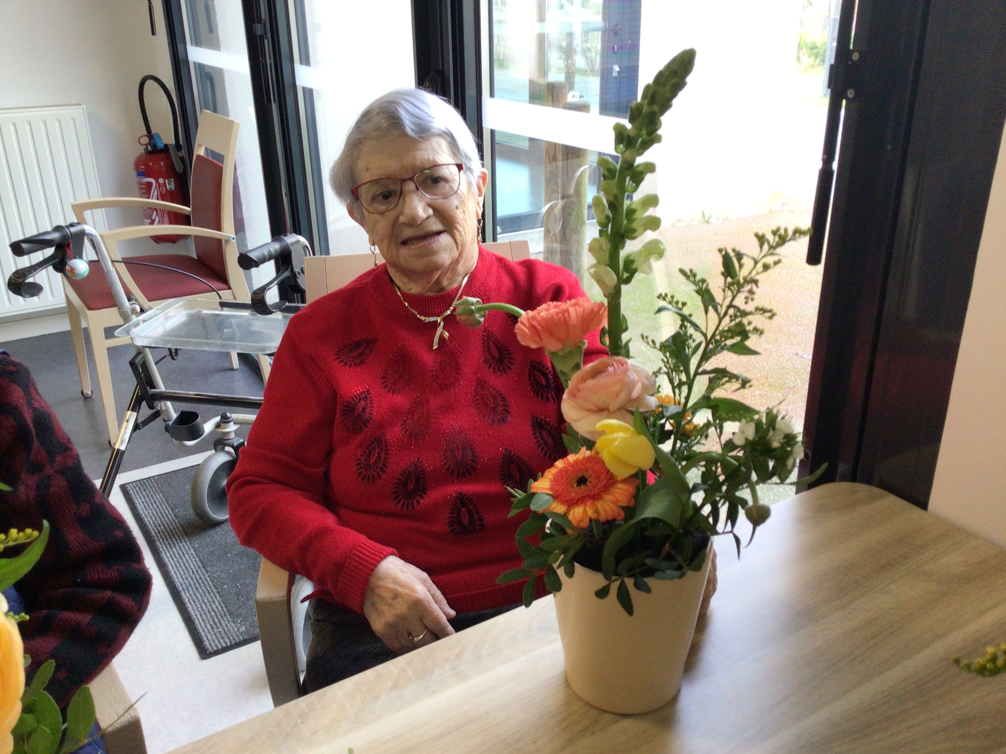 art floral ce matin en compagnie d'honorine de Miletunefleurs Honorine et de notre bénévole Jacqueline : création d'une composition florale pour agrémenter sa chambre. En suivant les consignes de la fleuriste, chaque résidente réalise sa composition florale et en bavardant.
