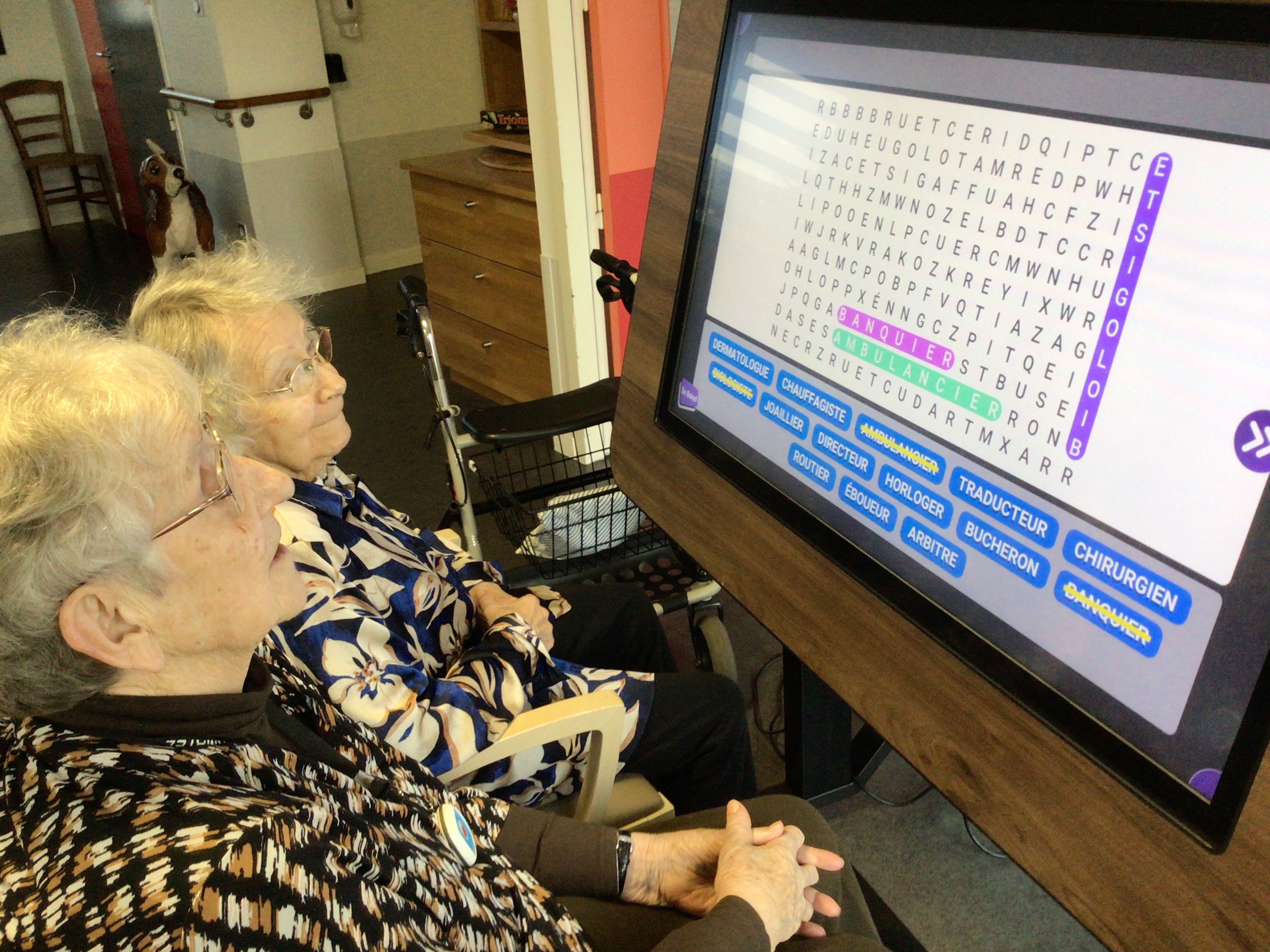 Pour stimuler sa mémoire et sa dextérité, des résidentes jouent sur la table de jeux aux mots mêlés. Pas toujours facile de trouver le mot quand il est écrit à l'envers!